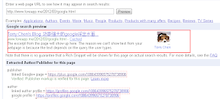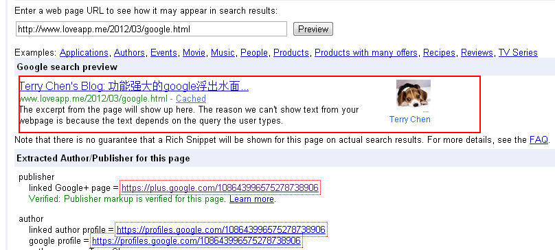 http://www.google.com/webmasters/tools/richsnippets?url=http%3A%2F%2Fwww.loveapp.me%2F2012%2F03%2Fgoogle.html&view=cse这里测试了下,可以显示头像如下图: